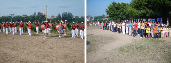 8時(shí),我們出發(fā)了?;顒?dòng)的第一站:鰲頭鎮(zhèn)白鶴坡小學(xué)。一路上塵土飛揚(yáng),經(jīng)過(guò)一個(gè)多小時(shí)的顛簸,終于來(lái)到了小學(xué)校區(qū),發(fā)現(xiàn)這里充滿著濃濃的鄉(xiāng)土氣息,與城市的繁華有著天壤之別。車還沒停穩(wěn),就聽到了一陣陣有節(jié)奏的鼓樂聲,原來(lái)學(xué)校的儀仗隊(duì)穿著整潔統(tǒng)一的隊(duì)服,像準(zhǔn)備接受檢閱的小士兵,站在校區(qū)門口熱烈歡迎著我們的到來(lái),我們進(jìn)入學(xué)校的時(shí)候,一張張企盼的小臉立刻映入眼簾,孩子們站在隊(duì)伍當(dāng)中,掂起小腳,臉上掛著天真爛漫、歡樂燦爛的笑容。