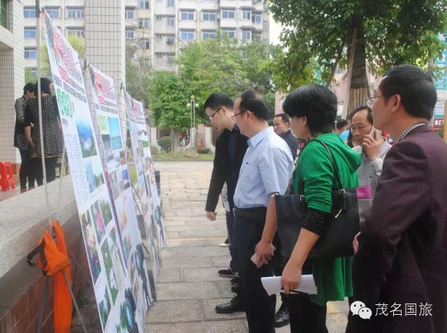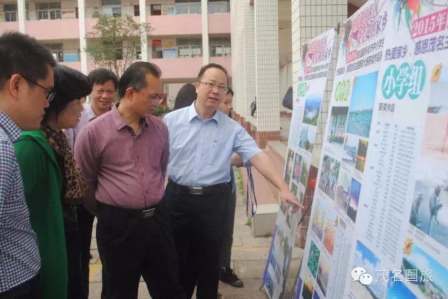 茂名市教育局黨委書記、局長羅欣榮和市教育局黨組成員、副局長李挺、市教育局辦公室主任梁鎮(zhèn)源、市教育局德育科科長林偉紅、茂名國旅總經理吳卡達等在作品宣傳欄前觀看獲獎作品展