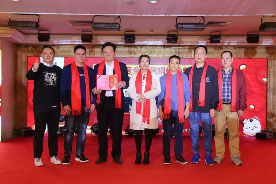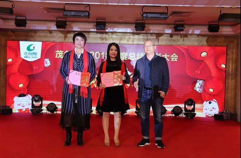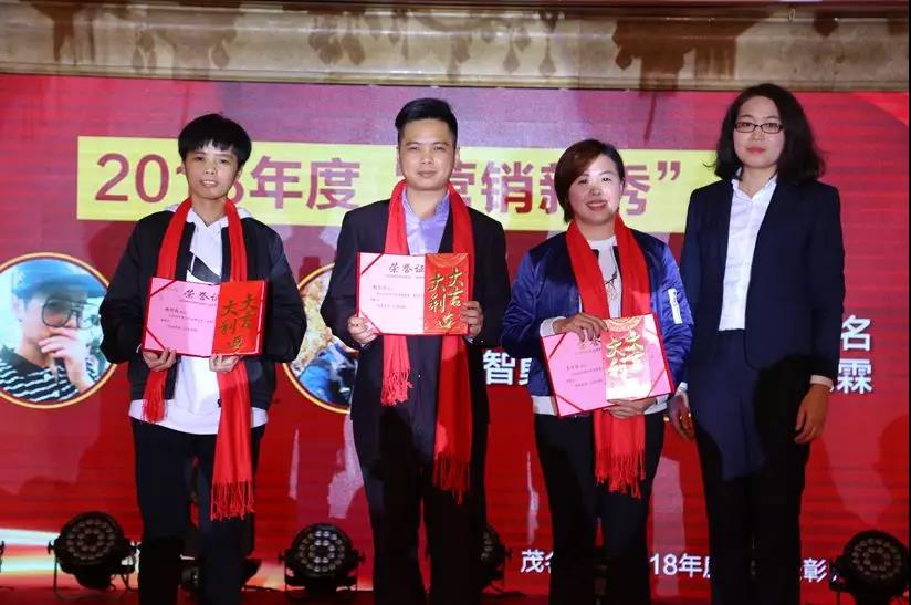 ▲傳媒公司總經(jīng)理高蘭為2018年度“營銷新秀”獎獲得者:楊智莉、楊智勇、岑俏霖頒獎。
