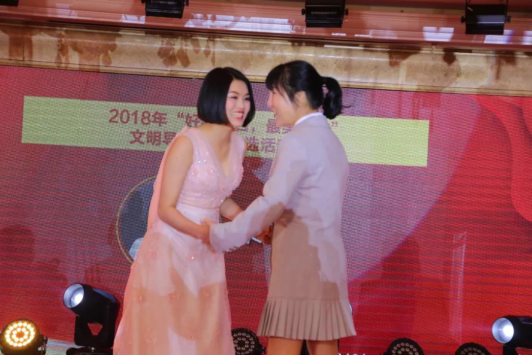 ▲副總經(jīng)理劉穎為前臺接待部2018年度“優(yōu)秀門店”獎獲得者:化州前臺、電白前臺頒獎。