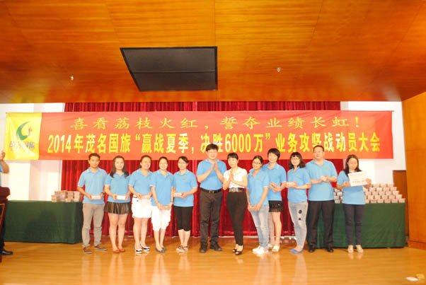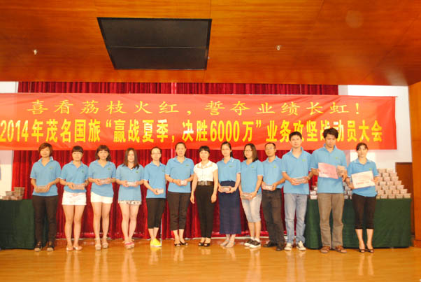 會(huì)上,公司副總經(jīng)理陳國(guó)斌代表公司宣讀了《茂名國(guó)旅2014年“贏戰(zhàn)夏季、決勝6000萬(wàn)”業(yè)務(wù)攻堅(jiān)戰(zhàn)活動(dòng)方案》的文件。文件要求,公司在夏季暑期期間,要全力達(dá)成旅游版塊營(yíng)收6000萬(wàn)元的目標(biāo)任務(wù),并圍繞這個(gè)目標(biāo)任務(wù)開(kāi)展“大戰(zhàn)100天,決勝6000萬(wàn)”業(yè)務(wù)攻堅(jiān)戰(zhàn)活動(dòng)。文件宣讀完畢后,是任務(wù)指標(biāo)授牌儀式,由分管領(lǐng)導(dǎo)向部門經(jīng)理頒發(fā)任務(wù)指標(biāo)牌,部門經(jīng)理帶領(lǐng)部門員工作表決心發(fā)言。在授牌過(guò)程中,公司安排了一個(gè)別出心裁的環(huán)節(jié),由公司董事長(zhǎng)費(fèi)明龍、總經(jīng)理吳卡達(dá)向上臺(tái)表決心的員工每人發(fā)一盒剛剛成熟的新鮮荔枝,寓意“荔枝紅了,業(yè)績(jī)更要紅”!