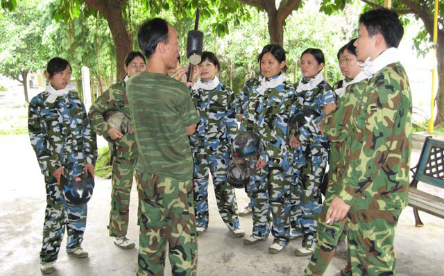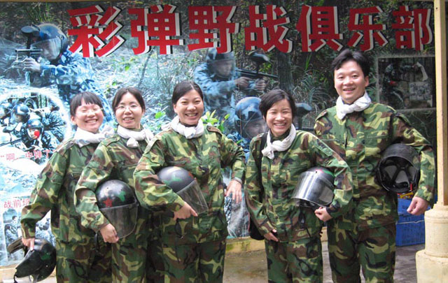 第三天早餐后,我們來(lái)到中山的泉林山莊,這里匯集了各種娛樂(lè)項(xiàng)目。我們直奔主題,來(lái)到了野戰(zhàn)部落。十人分成兩個(gè)對(duì)抗小組,我方是防守的共軍,進(jìn)攻方是王晟領(lǐng)導(dǎo)的國(guó)軍。穿上各軍的軍服,帶上頭盔,真有點(diǎn)雄糾糾的威武樣子。武器裝備就是每人一把機(jī)關(guān)槍?zhuān)?8發(fā)子彈(了彈外表是紅色的,更象糖衣炮彈)。這把槍有沖鋒槍的樣子,但只有玩具槍的效果,誤差極大,基本上是聲東擊西。