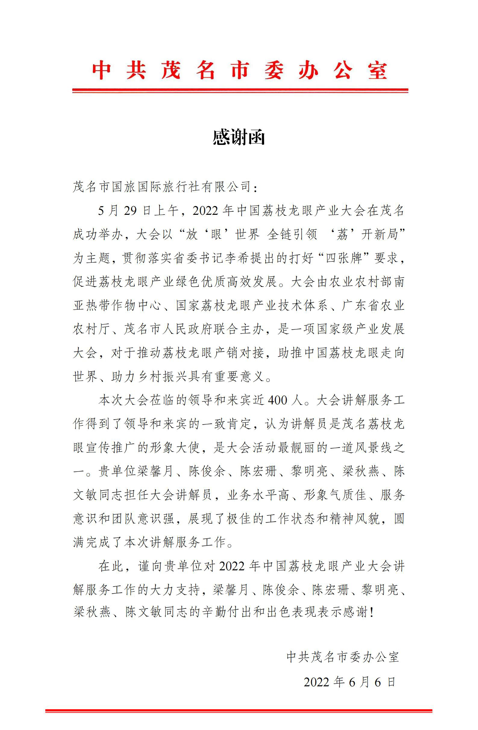 今天,茂名國旅收到了一封鼓舞人心的信函:由市委辦公室發(fā)來的感謝函。原來是茂名國旅在2022年中國荔枝龍眼產(chǎn)業(yè)大會上組織與統(tǒng)籌講解小組的工作方面表現(xiàn)出色,因此收到了市委辦公室的表揚與肯定。