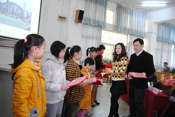 茂名國旅總經(jīng)理吳卡達、茂名市教育局德育科副科長呂其仙為小學組三等獎獲得者頒獎