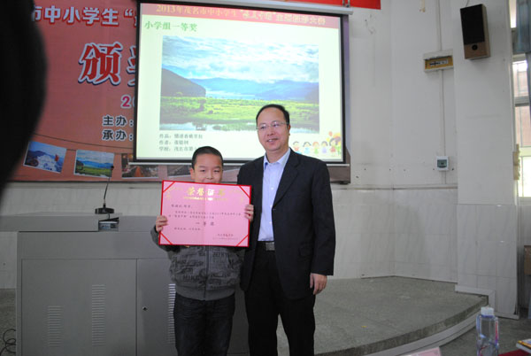 茂名市攝影家協(xié)會主席、本次大賽主評委彭永強先生為小學組二等獎獲得者頒獎