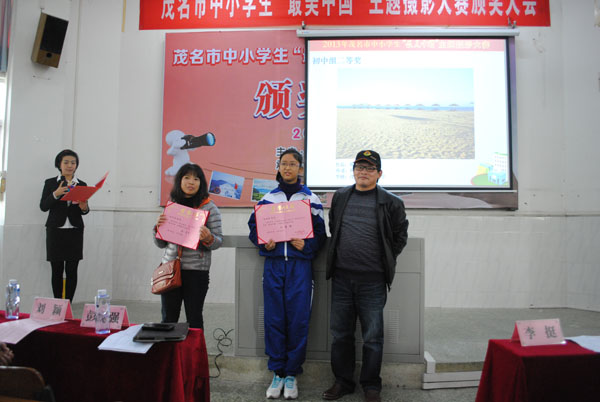 茂名市攝影家協(xié)會主席彭永強先生為初中組二等獎獲得者頒獎