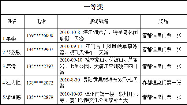 2010年是茂名國旅“感動客戶年”,以質(zhì)量密函形式為團(tuán)隊(duì)質(zhì)量提供幫助也是首創(chuàng)粵西地區(qū)之先河。在密函使用過程中得到了廣大游客的真誠反饋,為我社各項(xiàng)優(yōu)質(zhì)服務(wù)工作提供了有力的幫助。我社在10月10日舉行了第二次質(zhì)量密函抽獎,產(chǎn)生中獎名單如下: