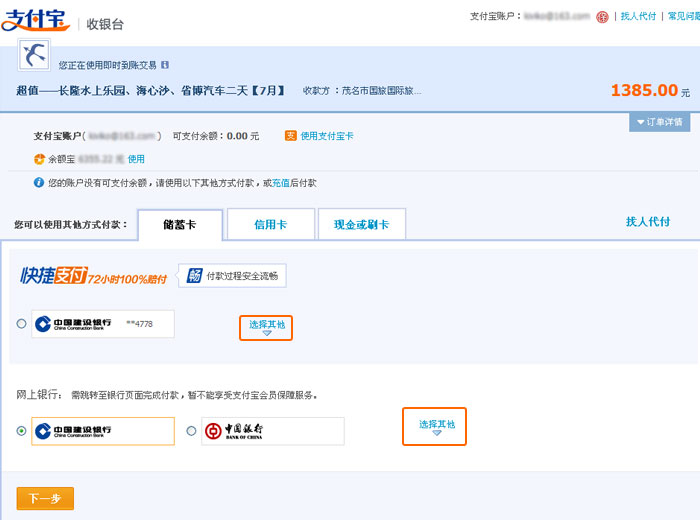 如果您支付寶帳號(hào)有錢的情況下可以直接用,您也可以使用網(wǎng)上銀行,如果你想選擇其他銀行點(diǎn)擊【選擇其他】,選擇確定就可以了。