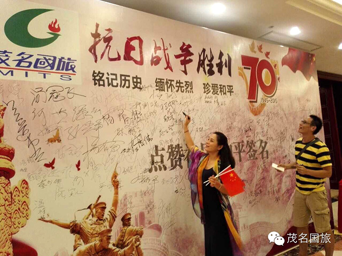 在會場,茂名國旅還特別安排了茂名明星導游王立娜表演詩朗誦《紀念抗戰(zhàn)勝利70周年》、現(xiàn)場400人齊唱國歌等有意義的活動。同時,茂名國旅在現(xiàn)場為市民準備了月餅、紅酒、水果、飲料和小點心,有點讓市民們提前過中秋的節(jié)奏。參團市民們個個笑逐顏開,紛紛贊許茂名國旅優(yōu)質的服務,并表示參加這樣的活動很有意義。