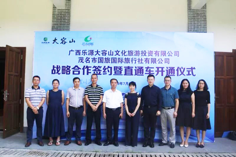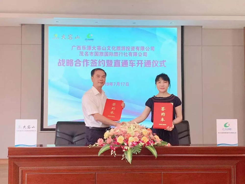2019年7月17日上午10點,廣西樂源大容山文化旅游投資有限公司與茂名市國旅國際旅行社有限公司戰(zhàn)略合作簽約暨直通車開通儀式在大容山國家森林公園舉行。大容山董事長、總經(jīng)理黃顯生及其領(lǐng)導(dǎo)班子,茂名國旅董事長費民龍、總經(jīng)理吳卡達(dá)等領(lǐng)導(dǎo)及有關(guān)部門代表等人員參加了活動,當(dāng)天直通車首發(fā)團(tuán)約300人,直通車開通極大便利了從茂名出發(fā)至大容山國家森林公園的游客,受到游客的一致好評。