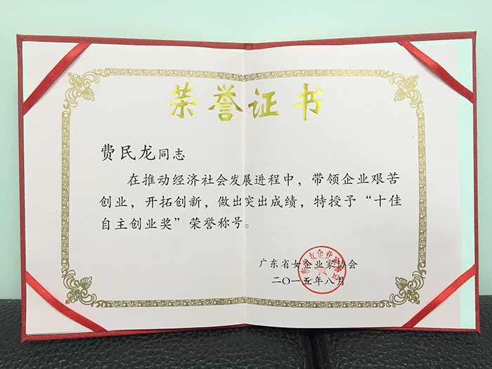 2015年8月31日,廣東省女企業(yè)家協(xié)會第六屆會員代表大會在廣州召開,協(xié)會經走訪、調查等審核,授予茂名市國旅國際旅行社董事長費民龍“2015廣東省女企業(yè)家十佳自主創(chuàng)業(yè)獎”。