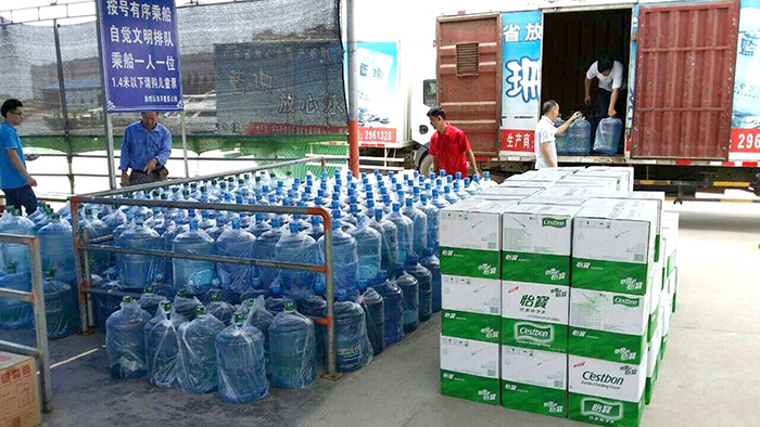 緊張和有序的工作馬上有條不紊的展開(kāi),在確定依舊有300多名游客愿意繼續(xù)行程后,茂名國(guó)旅馬上在全市聯(lián)系水源,經(jīng)過(guò)一上午的緊急調(diào)運(yùn),中午1點(diǎn),滿(mǎn)滿(mǎn)三大車(chē)礦泉水終于在大批游客抵達(dá)前送抵放雞島碼頭,8噸的礦泉水被茂名國(guó)旅和放雞島的工作人員肩挑手提的一罐罐、一桶桶的搬運(yùn)到碼頭,確保了每位游客都有1罐5公斤的飲用純凈水用于飲用、1桶20公斤的礦泉水用于洗漱。