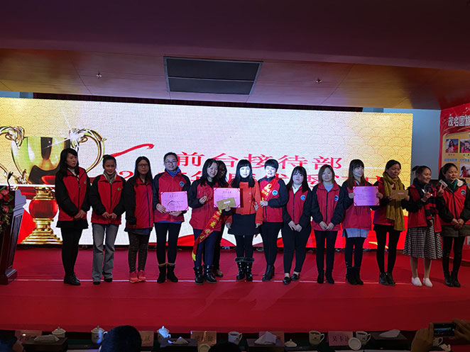 總經(jīng)理助理董德強(qiáng)、王洵為前臺(tái)接待部微笑之星獲得者何林鄉(xiāng)、譚曉珊、黃章清、劉晶晶、林曉鍵、陳桃曉、陳萍、鄭小梅、柯瑤頒獎(jiǎng)