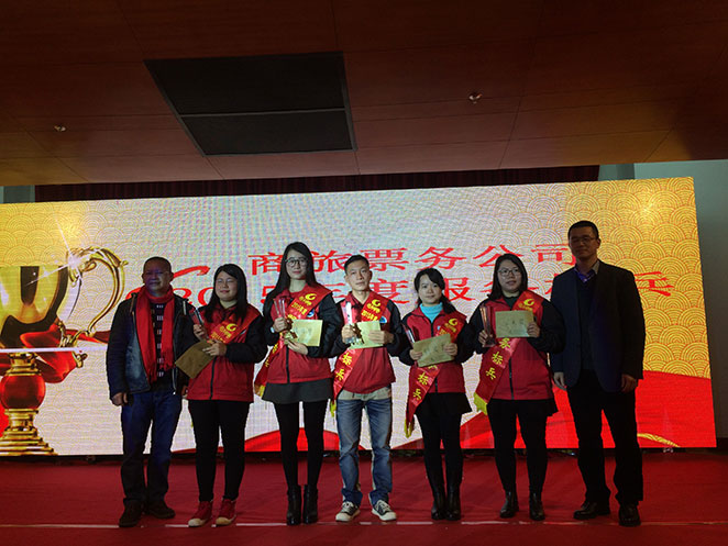 副總經(jīng)理梁湘軍,總經(jīng)理助理董德強(qiáng)為票務(wù)公司2015年度服務(wù)標(biāo)兵梁小霞、譚清華、潘漢毛、柯碧霞、宋美霞頒獎(jiǎng)