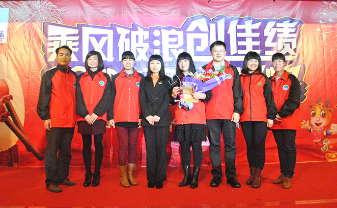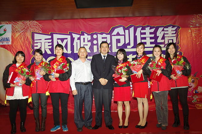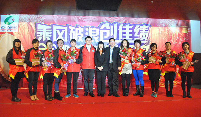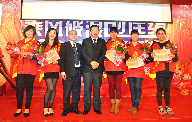 董事長(zhǎng)費(fèi)明龍,總經(jīng)理吳卡達(dá),副總陳國(guó)斌為2014年度先進(jìn)工作者陳杏、梁云琦、宋美霞、李華、賴(lài)恒珠、吳偉琴、張小玲、柯明君、譚瑩珠、張小梨、頒獎(jiǎng)