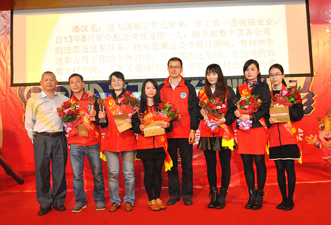 董事長(zhǎng)費(fèi)明龍,總經(jīng)理吳卡達(dá),副總陳國(guó)斌為年度十佳導(dǎo)游蔡俊茂、梁進(jìn)華、吳家豪、吳寧英、溫春葵、潘江娣、林麗萍、何金波、劉世文、張鳴頒獎(jiǎng)