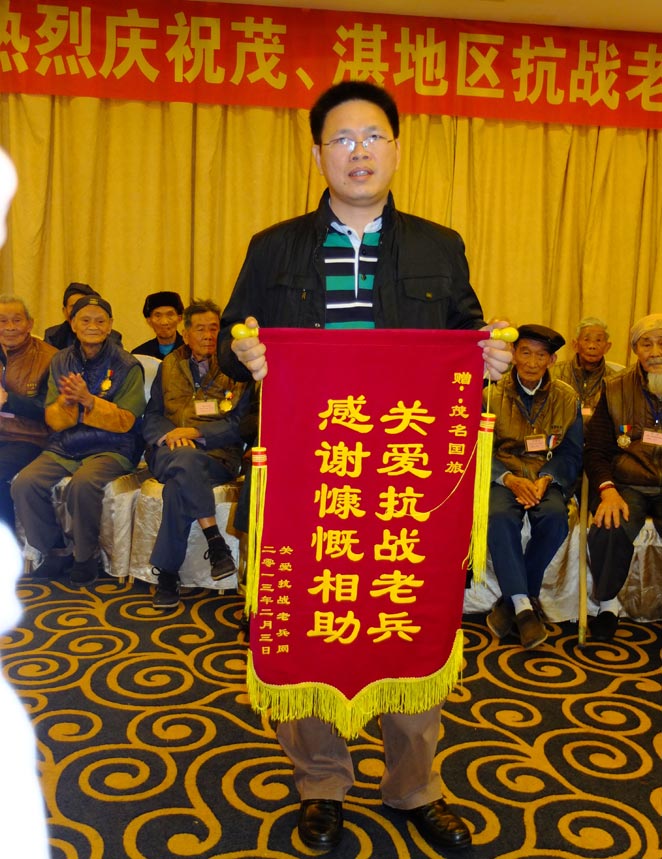 此次活動(dòng)由廣東省關(guān)愛(ài)抗戰(zhàn)老兵網(wǎng)和茂名本地義工愛(ài)心組織主辦,茂名國(guó)旅和茂名國(guó)際大酒店等協(xié)辦。為了對(duì)此次具有歷史意義的活動(dòng)表示重視,提高活動(dòng)接待規(guī)格,回報(bào)抗戰(zhàn)功臣,茂名國(guó)旅特意將此次活動(dòng)推薦安排在五星級(jí)酒店茂名國(guó)際大酒店舉行,并和酒店方升級(jí)安排了舒適的住房和豐盛的午餐,讓老兵們十分感動(dòng)。在聚會(huì)上,當(dāng)主持人逐一介紹到會(huì)的各位老兵的名字、抗戰(zhàn)時(shí)所在部隊(duì)番號(hào)及其擔(dān)任的職務(wù)、主要事跡等等時(shí),活動(dòng)達(dá)到高潮,現(xiàn)場(chǎng)的志愿者和愛(ài)心企業(yè)代表紛紛以雷鳴般的掌聲向英雄們表達(dá)心中的崇敬之情。