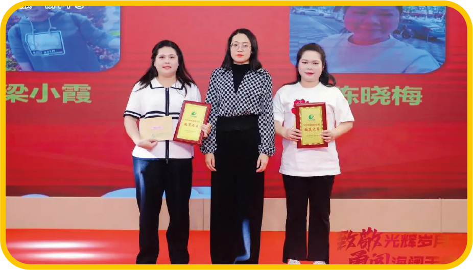 茂名新領(lǐng)粵傳媒有限公司總經(jīng)理高蘭為票務(wù)公司梁小霞、陳曉梅頒發(fā)2023年度微笑之星