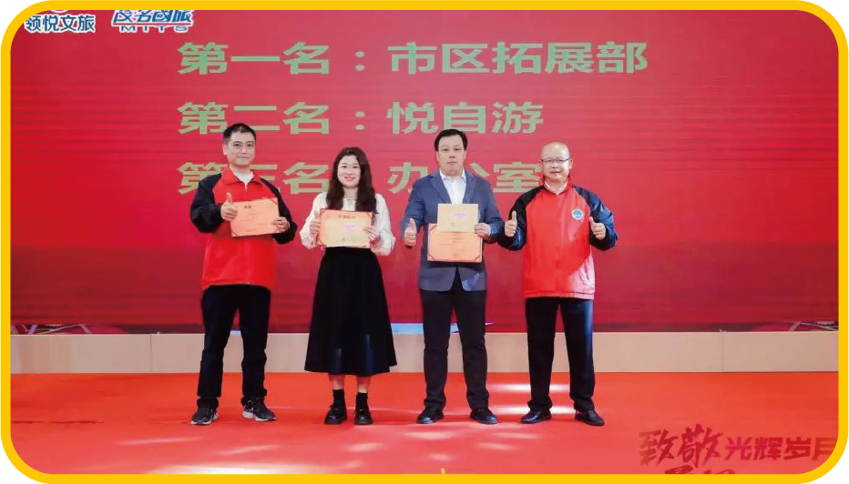 茂名國(guó)旅助理總經(jīng)理董德強(qiáng)為市區(qū)拓展部、悅自游、辦公室頒發(fā)2023年度單項(xiàng)預(yù)訂年度團(tuán)隊(duì)獎(jiǎng)