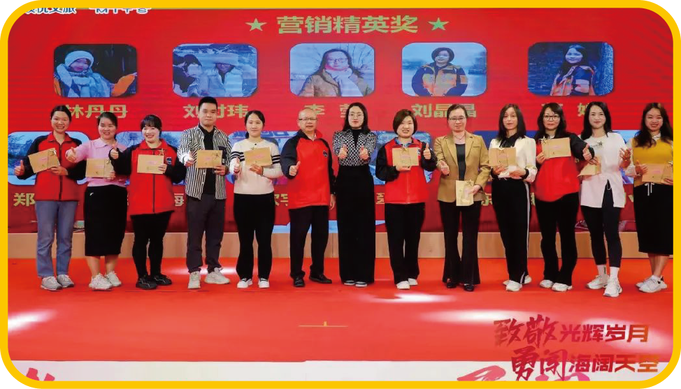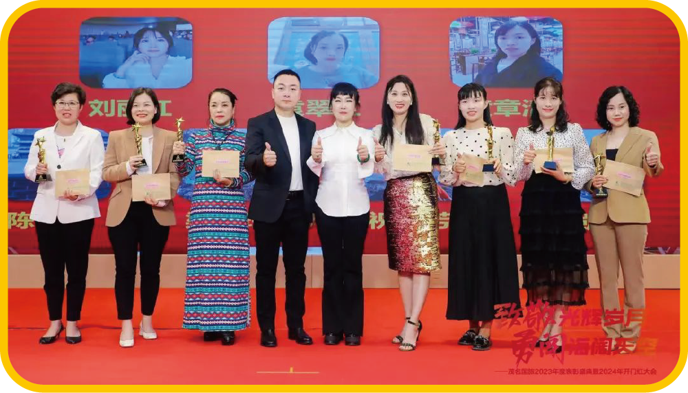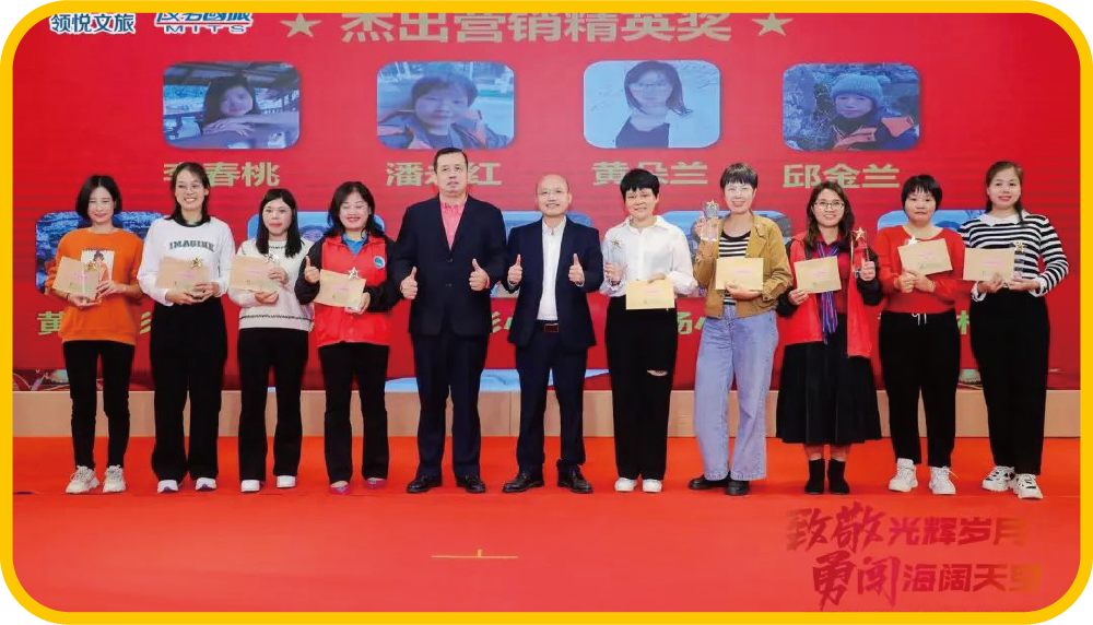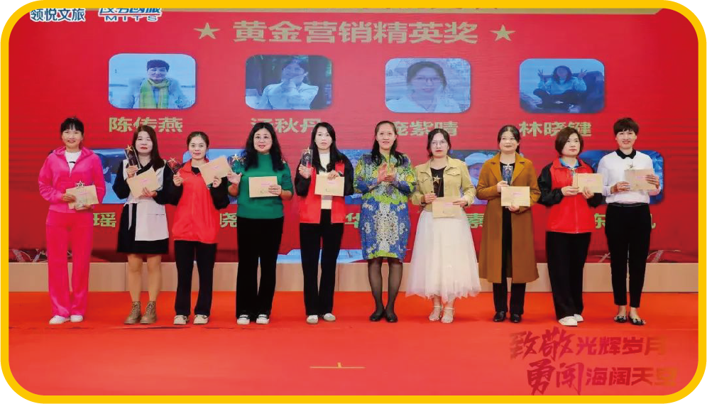 茂名國(guó)旅助理總經(jīng)理董德強(qiáng)、茂名新領(lǐng)粵傳媒有限公 司總經(jīng)理高蘭為林丹丹、劉付瑋、李瑩、劉晶晶、 范嬋、鄭海棠、鄭小梅、李欣宇、吳翠玲、陳海斌、 梁小花頒發(fā)營(yíng)銷(xiāo)精英獎(jiǎng)