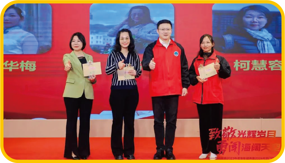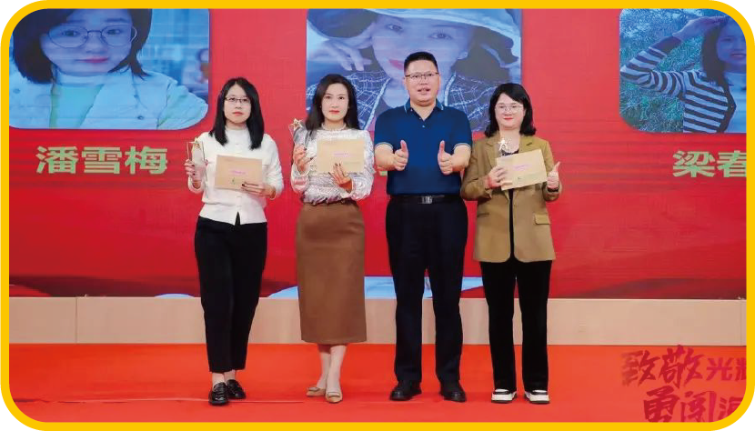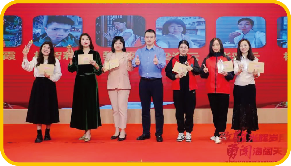 茂名國(guó)旅董事長(zhǎng)費(fèi)民龍、執(zhí)行董事李泓希、總經(jīng) 理吳卡達(dá)為黃清霞、嚴(yán)潤(rùn)茜、陳海燕、梁燁、李 瑞標(biāo)、車(chē)雨琦、陳肖連、彭文莉、譚瑩珠、張偉 倫、柯明君、袁翠紅、梁雪玲、陳天鳳、余凱慧 頒發(fā)2023年度先進(jìn)工作者獎(jiǎng)