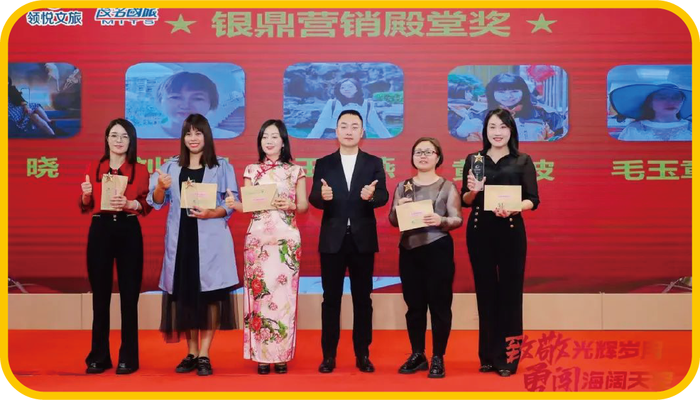 茂名國(guó)旅執(zhí)行董事李泓希為林曉、劉顏娟、王玲 燕、黃清波、毛玉章頒發(fā)銀鼎營(yíng)銷(xiāo)殿堂獎(jiǎng)