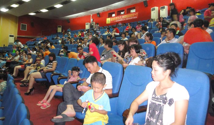 員工及家屬在等待電影開影