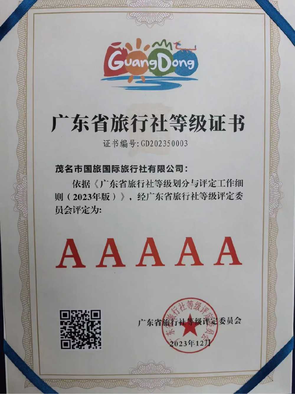重磅榮譽 高光時刻 茂名國旅獲評廣東省首批5A級旅行社!