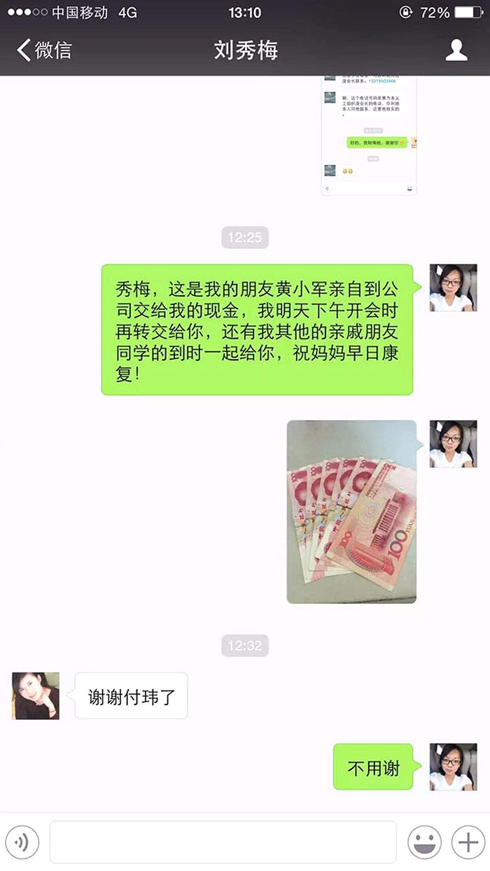 捐款倡議發(fā)出后,茂名國旅這個大家庭持續(xù)呈現(xiàn)著令所有國旅人感動的一幕幕。國旅員工除了踴躍捐款外,還積極發(fā)動親朋好友捐款,短短兩天,國旅辦公室就籌得善款40000多元(其中現(xiàn)金2萬元、微信紅包2萬多元)。國旅人以積極行動踐行了茂名國旅是一個“溫暖可愛的大家庭”的企業(yè)文化。此次捐款活動,除了公司員工慷慨解囊外,最令我們感動的是,包括國旅忠實客戶在內的社會各界人士積極參與,點滴仁愛之心匯成一股股暖流,傳遞著愛的力量和生命的熱度,讓劉秀梅家庭看到了希望的曙光。