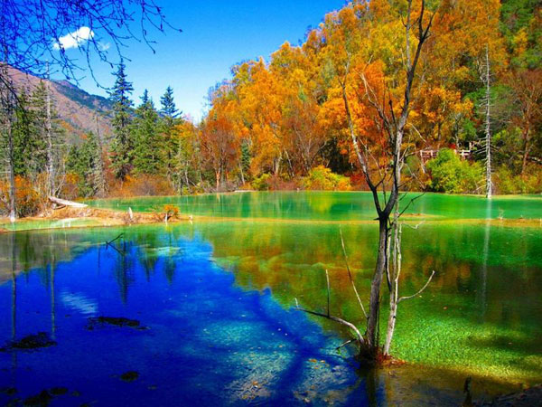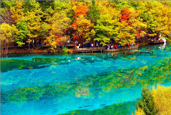 整個(gè)溝內(nèi),奇湖錯(cuò)落,目不暇接。百余湖泊,個(gè)個(gè)古樹環(huán)繞,奇花簇?fù)?,宛若鑲上了美麗的花邊。湖泊都由激流的瀑布連接,猶如用銀鏈和白涓串連起來(lái)的一塊塊翡翠,各具特色,變幻無(wú)窮。被譽(yù)為“九寨溝的靈魂”的五花海,更是籠罩在一片絢麗中,色彩豐富,姿態(tài)萬(wàn)千。它以其瑰麗的水底世界讓人嘆為觀止,鈣華沉積和各種色澤艷麗的藻類,使得一湖之中分成許多色塊,寶藍(lán)、翠綠、橙黃、淺紅,似無(wú)數(shù)寶石鑲嵌成的巨形佩飾,珠光寶氣,在海底散發(fā)著迷人的風(fēng)采。另還有季節(jié)海、箭竹海、熊貓海、臥龍海、犀牛海、老虎海、孔雀海……那一汪汪清水瀅湖,讓你忍不住想要擁它入懷,甚至融化其中。
