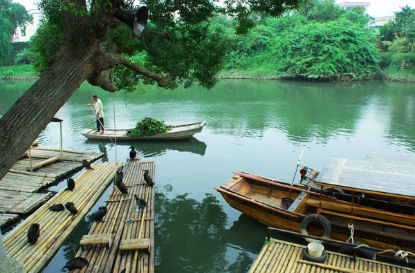 嶺南水鄉(xiāng)和蘇杭水鄉(xiāng)同樣有小橋流水和枕水人家、雞犬蛙鳴一片;不同的是也許受了“南蠻”之氣的感染,民俗文化卻迥于蘇杭。嶺南水鄉(xiāng)的風光更帶點陽剛之氣。水鄉(xiāng)有船,輕舟秀水,香蕉荔枝龍眼成行成片。三十幾里水涇僅是民眾水鄉(xiāng)的一小部分,嶺南水鄉(xiāng)的水上游項目主要是指的這一段。近水而建的吊腳杉皮房,像一個遠古的童話,最是讓人溫馨。第一代的茅寮房已只能在嶺南水鄉(xiāng)的總部看得到了,第二代的杉皮房子和現代的水泥樓房參差成一種新舊對照,像建筑風情展廊一般地反映了水鄉(xiāng)人的生活從 窮變富的變化。房前屋后種了不少果子,四時均有各種鮮果成熟。每戶人家有自己的碼頭,或多或少擁有幾條小艇,上岸后的蛋家人大多已車步當舟,專業(yè)運輸戶則換成了大船搞起運輸,這種小艇便不常用了,泊在岸邊成了裝飾,或者是一種懷舊。