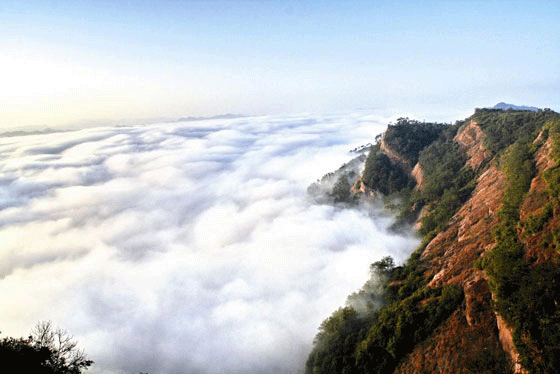 由于北流河海拔僅40米,相對(duì)高差達(dá)256.6米的石表山氣勢(shì)磅礴,巖層傾向西北角,傾角22度,平行北流河的單斜赤壁丹崖從容縣和藤縣交界的界排沖一直連綿延伸到思羅河與北流河交匯的道家村,長達(dá)數(shù)十公里的丹霞畫廊,猶如展開了一幅天然壯錦。