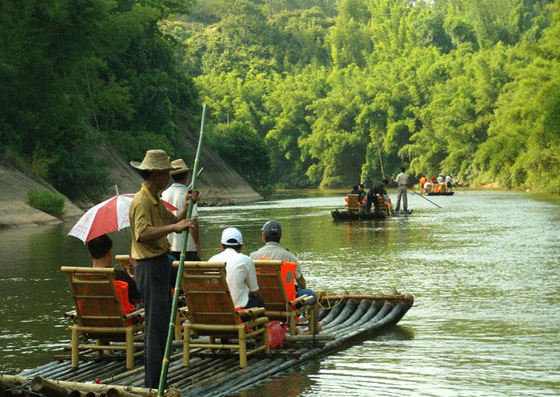 思羅河漂流是利用風(fēng)光秀麗、河寬60米、總長(zhǎng)7公里的思羅河開(kāi)展休閑漂流旅游。坐在捆綁在一起的兩座竹排上漂流是十分休閑的,清澈的江水從腳下的竹排緩緩淌淌過(guò),兩岸皆是密密的竹林,仿如亭亭玉立的綠衣少女。一座接一座的赤壁丹崖,不時(shí)從岸畔延伸水面的大片沙灘,構(gòu)成了迷人的景色,令人目不暇接。有著“三洲八灘十五灣”著稱的思羅河,最誘人的就是水灣景色了。每轉(zhuǎn)一道水灣,一幅幅精美的水墨畫(huà)卷呈現(xiàn)眼前,宛若進(jìn)入了一道綠色的畫(huà)廊。滿眼的綠,滿眼的景,叫人陶醉,令人叫絕。