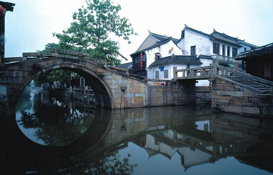 被稱為“中國第一水鄉(xiāng)”的周莊,位于上海、蘇州、杭州之間。又稱為澤國,四面環(huán)水,咫尺往來,皆須舟楫。全鎮(zhèn)依河成街,橋街相連,深宅大院,重脊高檐,河埠廊坊,過街騎樓,穿竹石欄,臨河水閣,一派古樸幽靜,是江南典型的小橋流水人家。周莊原來叫貞豐里,北宋時(shí)周迪把自己的房子捐出來建寺,也就是現(xiàn)在的金福寺,居民有感周氏的仁義,便把貞豐里改為周莊。