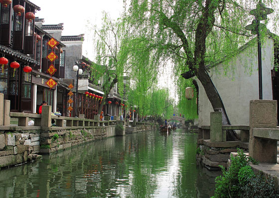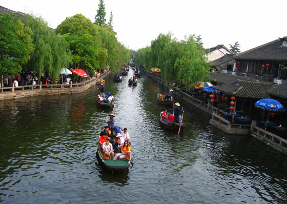 周莊的船很多, 來往穿梭的船總是給游人平添幾分匆匆,讓游人們更增對(duì)前面景色的好奇心。其實(shí),這匆匆的游船就是莊子里最有韻味的美景。通常,這些船都搭著一塊深藍(lán)色的布棚,搖櫓的船工都會(huì)耐心地等待游客上船,然后開心地?fù)u著櫓,帶上游客一路高歌而去。古老的木船不再古老,可那擺動(dòng)的大櫓仍然還沿著古老的軌跡,優(yōu)美地重復(fù)著過去的韻律,仍然吟唱著古老的船歌。
