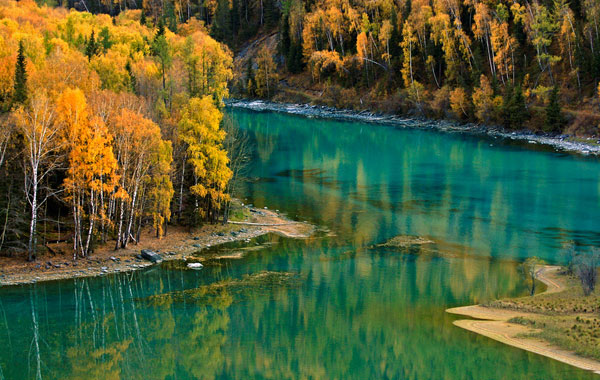 喀納斯湖還會(huì)隨著季候和天氣的變化時(shí)時(shí)變換著自己的顏色:或湛藍(lán)、或碧綠、或黛綠、或灰白……有時(shí)諸色兼?zhèn)洌瑵獾嚅g,成為有名的變色湖。受強(qiáng)勁谷風(fēng)的吹送,倒入喀納斯湖的浮木,會(huì)逆水上漂,在湖的上游湖灣處聚堆成千米枯木長堤,蔚為喀納斯湖的一大奇觀。