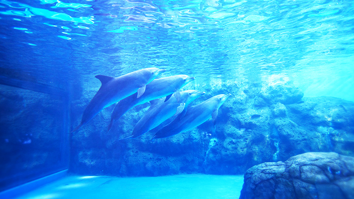 海豚灣 海豚灣整個區(qū)域以海豚展示為主,主要展出的有瓶鼻海豚和斑點海豚等。最不容錯過的是海豚劇場的海豚表演,可愛的海豚和飼養(yǎng)員一起玩游戲,動作和場景都非常精彩有趣;還有海豚保育中心,透過巨大的落地玻璃觀賞嬉戲中的海豚,仿佛置身海底,與海豚零距離,你會看到頑皮可愛的海豚向你游來,向你親密地打招呼,就像一個老朋友一樣!